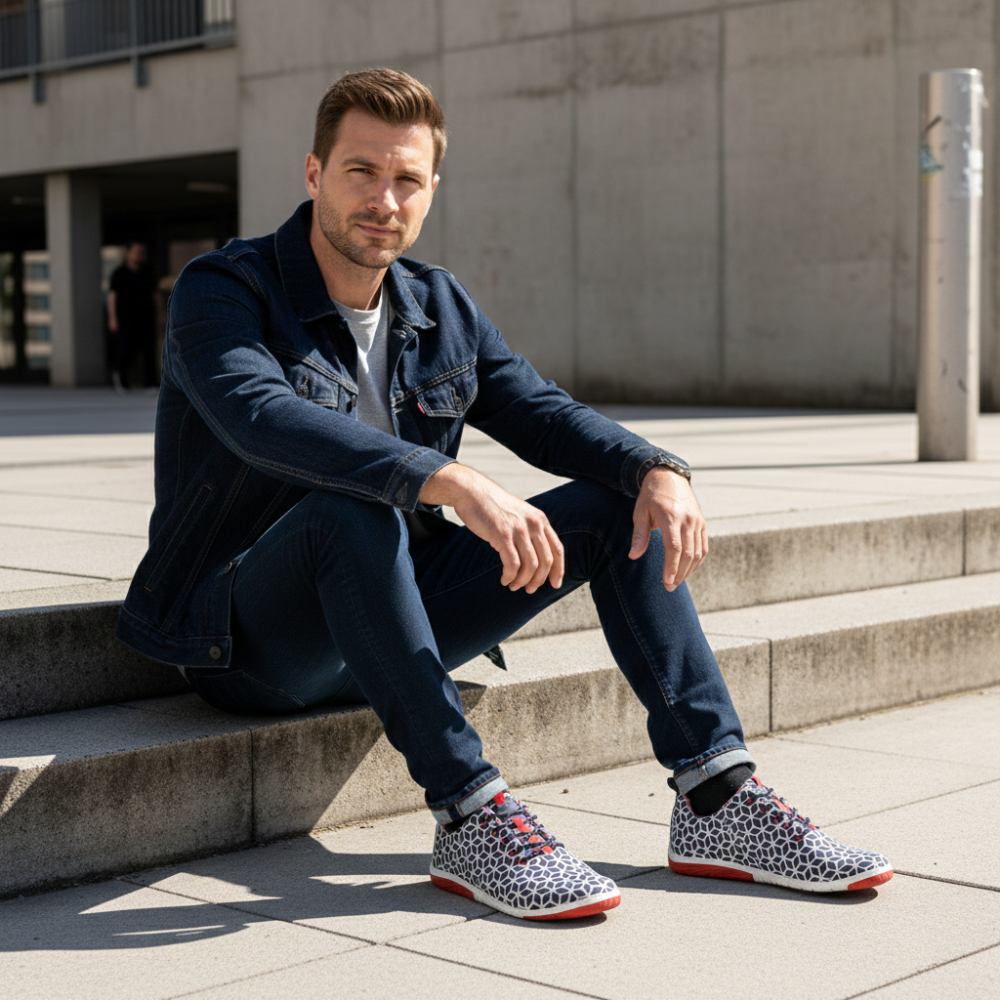 ABEQ Grey Red ist Dein Sneaker für den dynamischen Auftritt – ein Barfußschuh, der wie kein anderer aussieht!