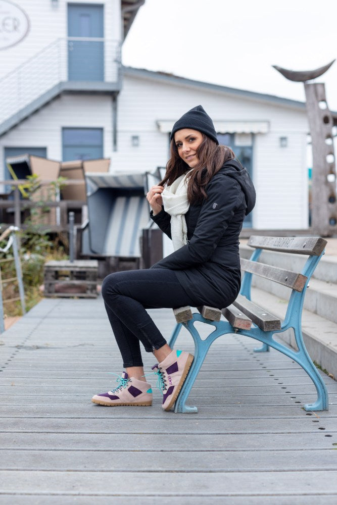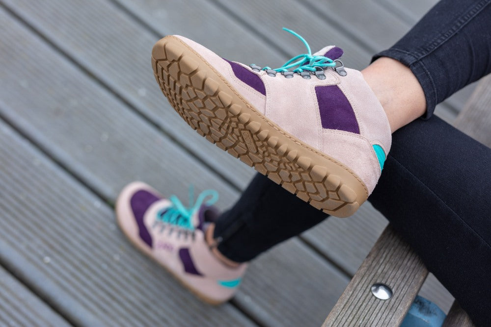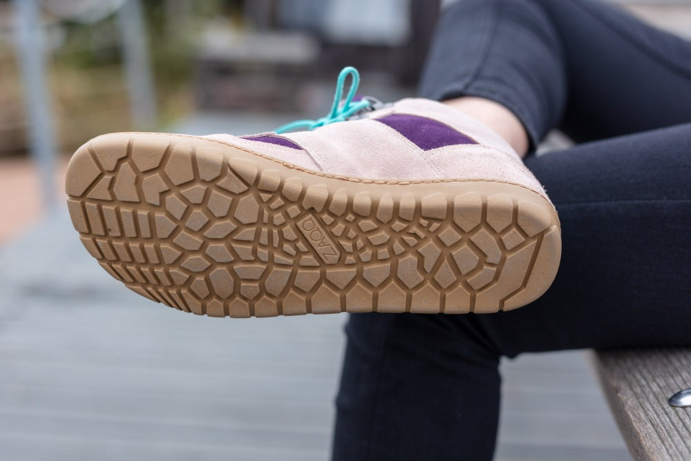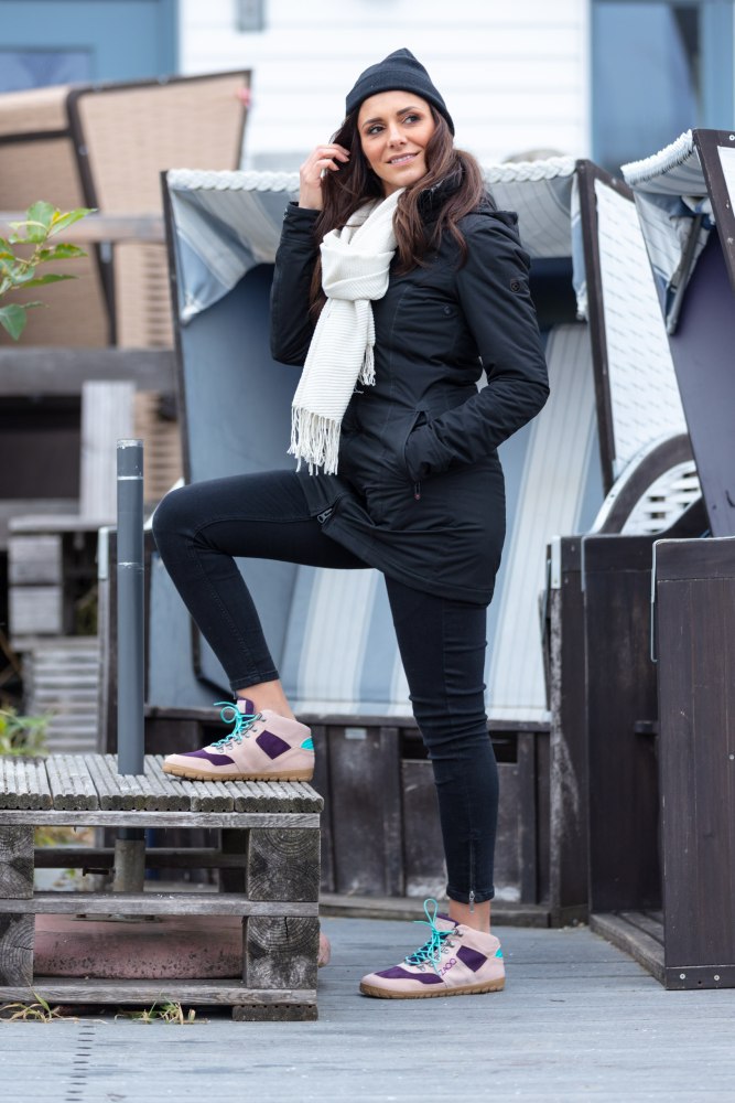 Zvuk je vyrobený zo semišu vysokej kvality v kombinácii jemného nahého a fialového. Tyrkysové detaily vzadu a šnúrky v rovnakej farbe predstavujú pekný kontrast. ZAQQ Membrána, ktorá je vetrom a vodotesným a priedušným.