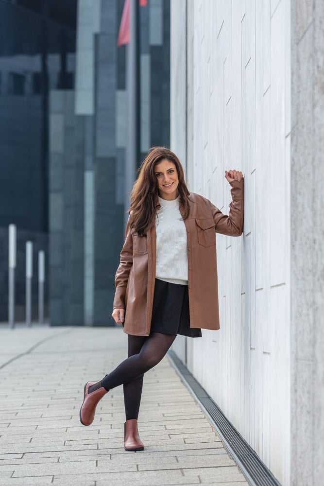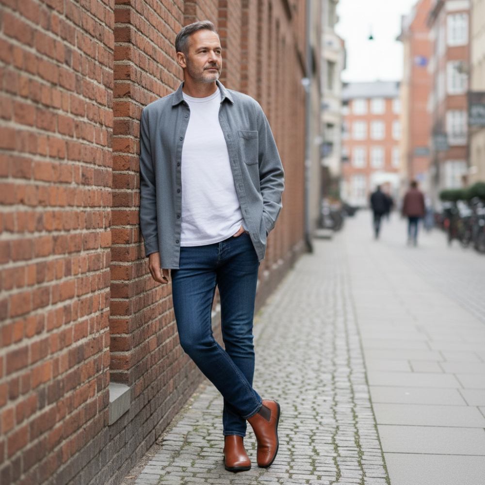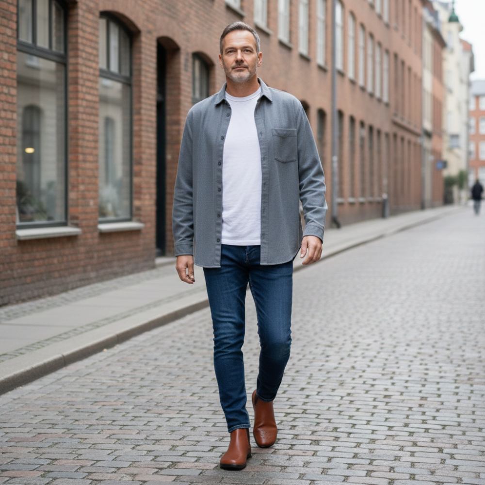 Chelsea topánky idú perfektne do príležitostných odevov. Do modrých džínsov v použitom vzhľade s blízkou košeľou a nadmernou košeľou nad ňou ste úplne neformálne a chladné. S Equity BroGoge Cognac rockujete etapy sveta!