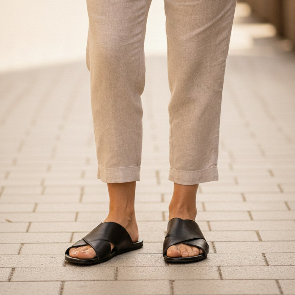 S dvoma skríženými koženými popruhmi, ktoré ponúkajú najlepšiu zastávku, môžete jednoducho vkĺznuť do čiernych sandálov Manqa a užiť si deň naplno. Žiadne pracky, žiadne ozdôbky - iba čisté pohodlie a sloboda pre vaše nohy. Tieto sandále kombinujú ľahkosť bosej topánky s eleganciou módneho príslušenstva.