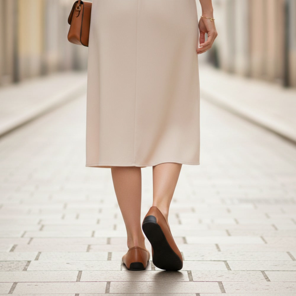 Kautschuksohle mit Nullabsatz, dadurch Entlastung der Wirbelsäule und Schonung der Gelenke, unterstützt die natürliche Körperhaltung