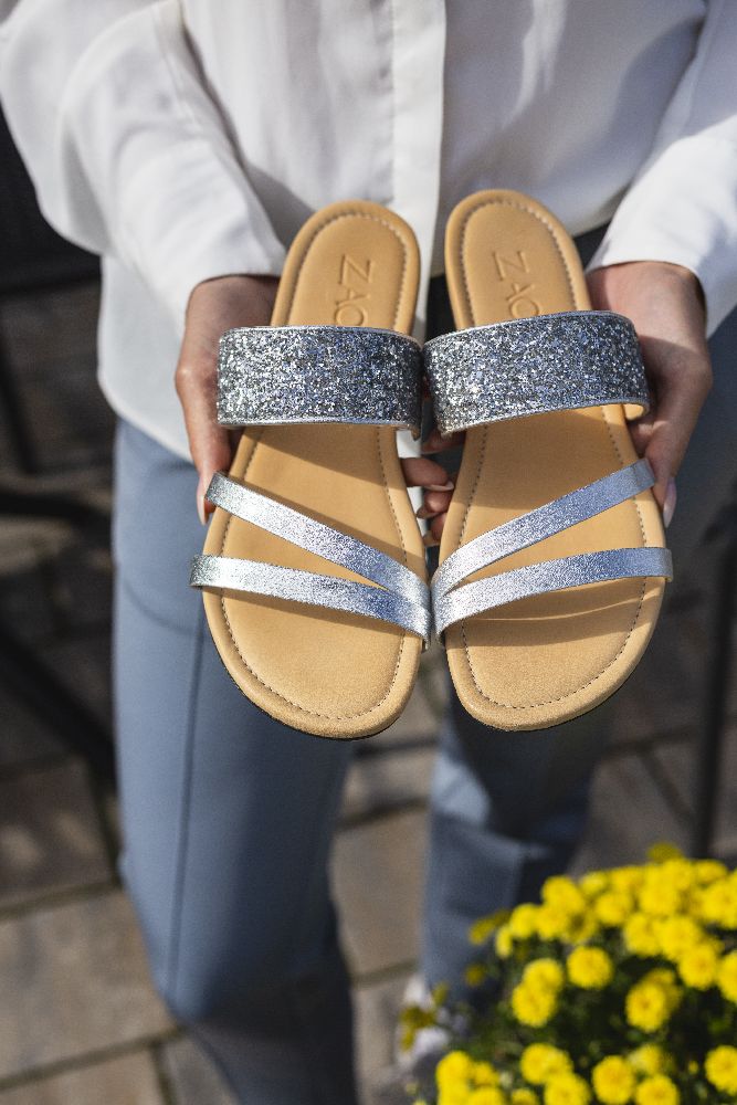 S lesklým strieborným povrchom tieto sandále naboso zachytia svetlo a pri každom kroku nastaví očarujúci prízvuk. Dizajn je elegantný a praktický, s dvoma jemnými popruhmi vpredu a širším popruhom nad napätím, ktoré nielenže oslovujú vizuálne, ale tiež zaisťujú optimálne držanie.
