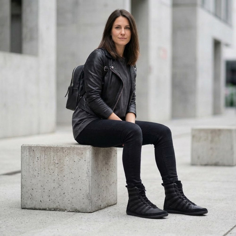 Verschiedene Materialien mit einheitlichem Farbkonzept geben diesem Barfußschuh seine ultramoderne Ausstrahlung. An den sensiblen Bereichen rund um die Sohle sowie an der Ferse haben wir robustes Veloursleder vernäht. In Verbindung mit dem perforierten Nappaleder und den aufgenähten Streifen, sieht unser SPARQ High Black aufregend aus, ohne zu sehr aufzufallen. Die hochflexible Barfußsohle gibt Dir den ultimativen Tragekomfort – laufen in unserem SPARQ High Black ist ein Hochgenuss für Deine Füße.