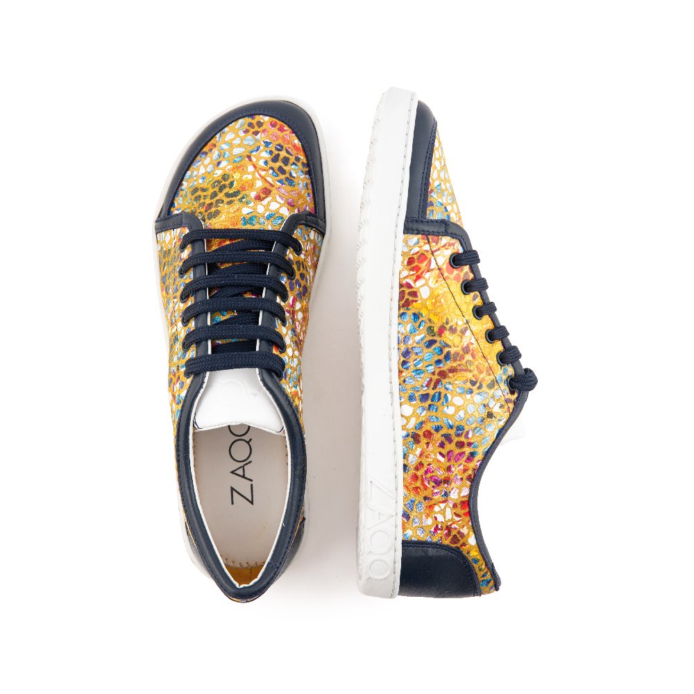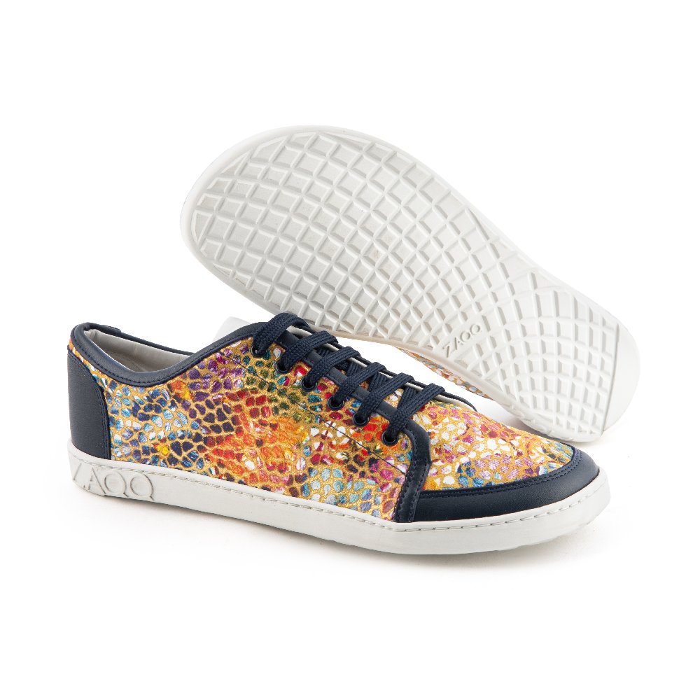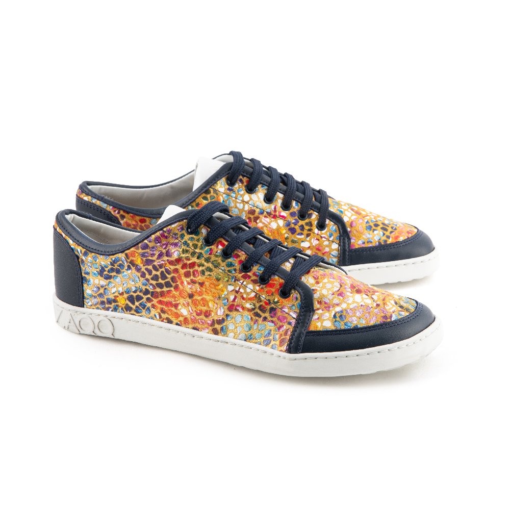 Táto bosá topánka je vyrobená z vysokej kvalitnej kože s farebným kvetinovým vzorom a detailmi s kompenzáciou v tmavomodrej farbe, je absolútnou očnou látkou! Ale táto teniska je tiež fenomenálna pre vaše nohy - ponúka veľa priestoru pre prsty na nohách a zároveň bezpečné držanie členkov.