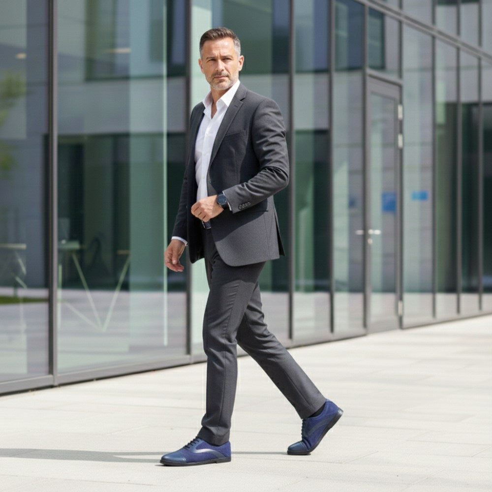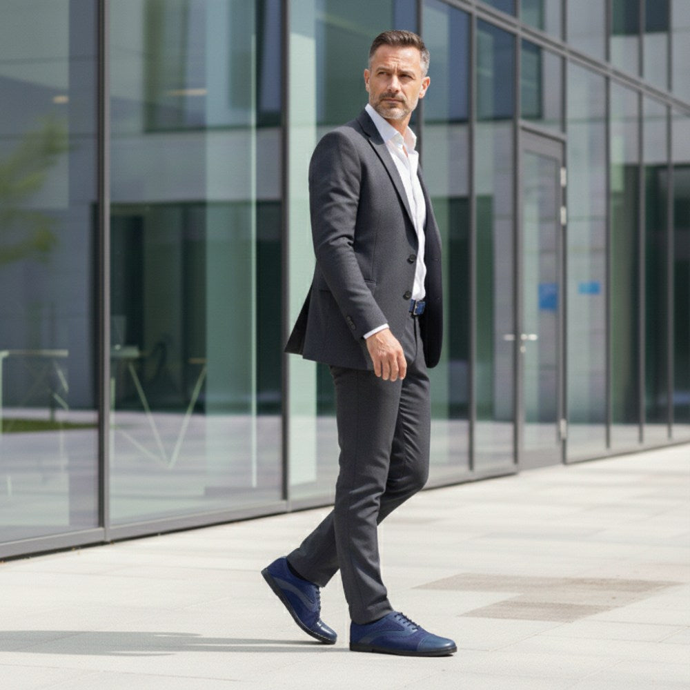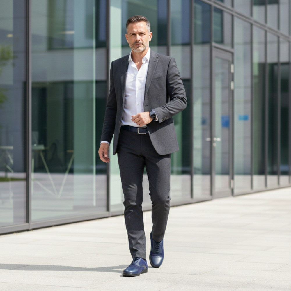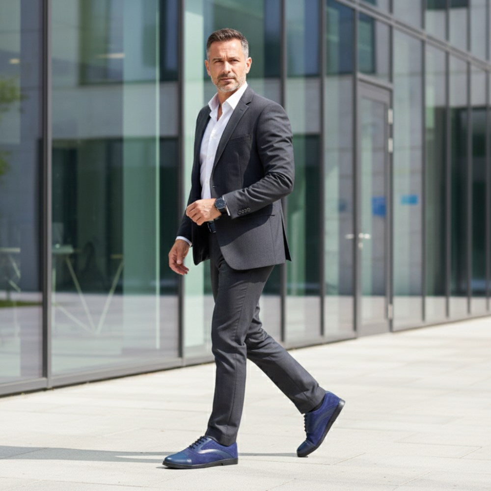 Z vonkajšej strany sa naša Qentle Blue predstavuje ako klasická topánka pripevnenia v tmavomodrej. Vďaka lesklej čiapke prstov, ktorá je zdobená jemnými broguingmi a líniami v okresnej oblasti, vyzerá náš Qentle obzvlášť ušľachtilý.