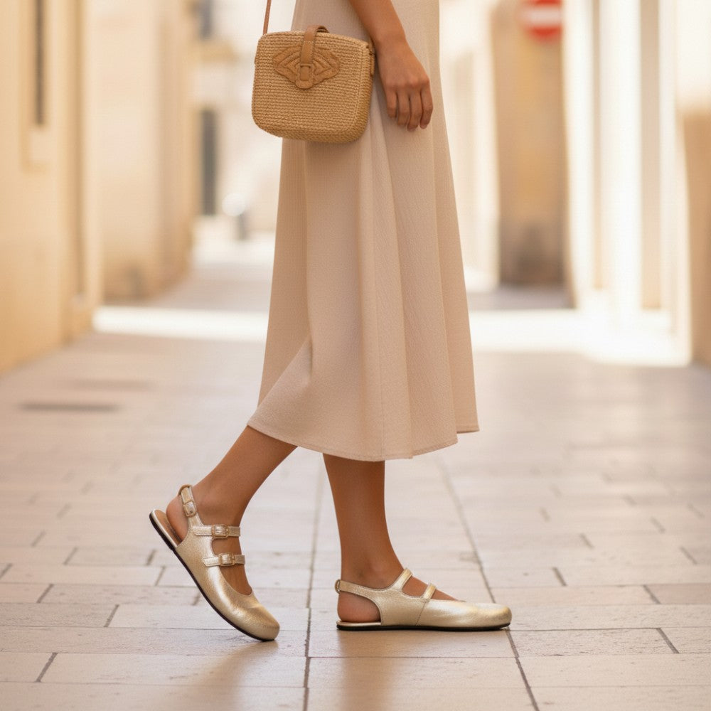 Naše Qomeet Gold kombinuje pôvab a pohodlie v otvorene rezanej balerínovej topánke. S nastaviteľnými popruhmi nad svorkou a ďalším popruhom na zadnej strane ponúka naše Qomeet Gold perfektné fit a bezpečné držanie pri každom kroku.