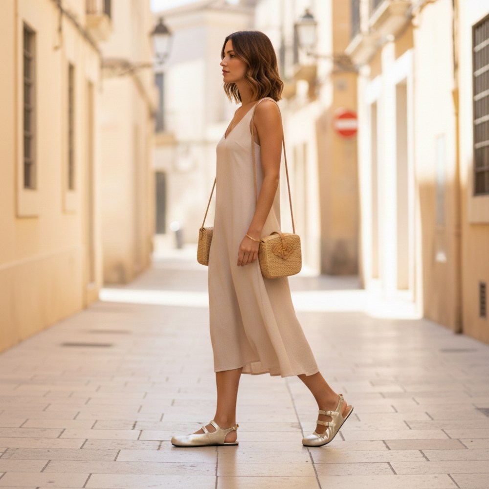 Flexibilná podrážka a koža z mäkkého lesku sa prispôsobuje vašim pohybom. Buďte aktívni celý deň bez predchádzajúceho štýlu - naše Qomeet Gold to umožňuje. Noste ich na svoje obľúbené letné šaty alebo ich kombinujte s tečúcimi nohavicami a elegantným vrcholom pre elegantný večerný vzhľad. Qomeet Gold tiež dáva vášmu oblečeniu džínsy a jednoduché tričko. Je to ideálny spoločník pre svadby, záhradné večierky alebo len deň v kancelárii, ak chcete dať svoj vzhľad špeciálny prízvuk.