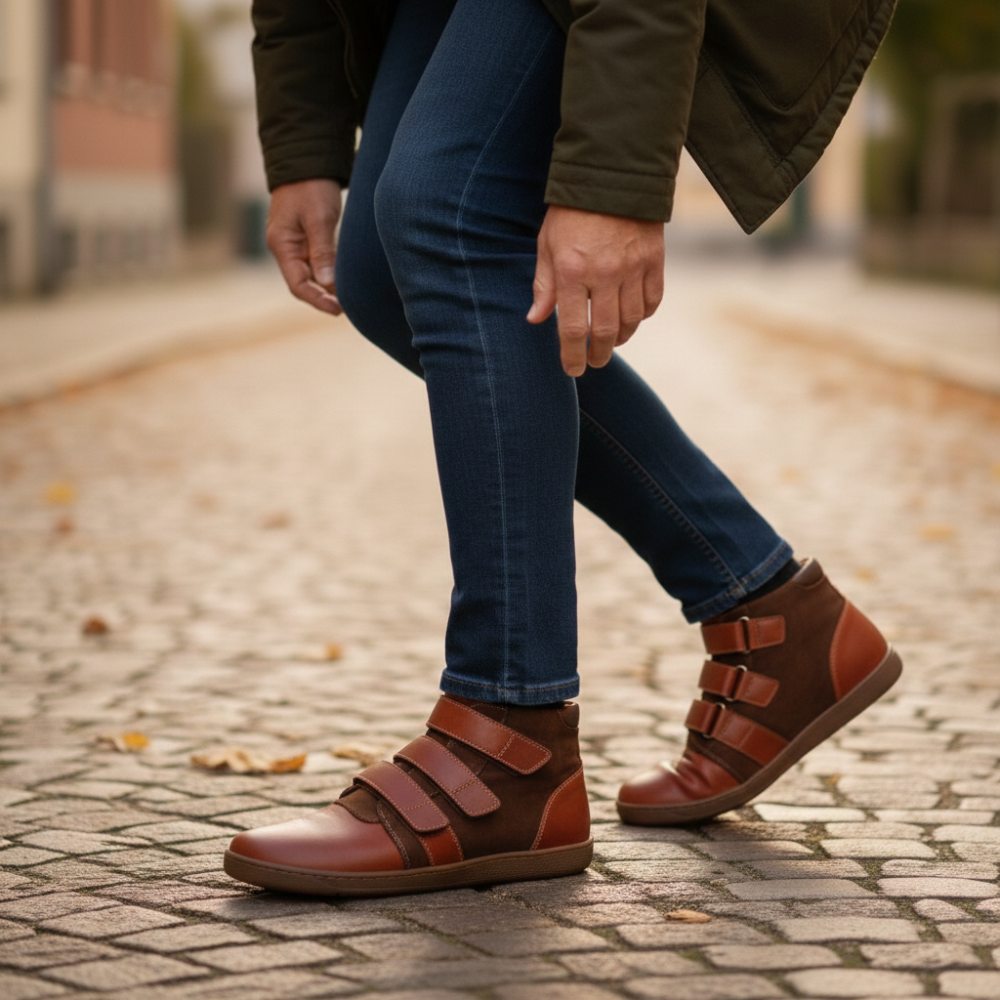 Qoooper je polovičná topánka na bosej bosej, ktorá vyzerá obzvlášť ušľachtilý kvôli svojej hnedej koži a je jednoducho neuveriteľne pohodlná s praktickým upevňovacím suchým zipsom.