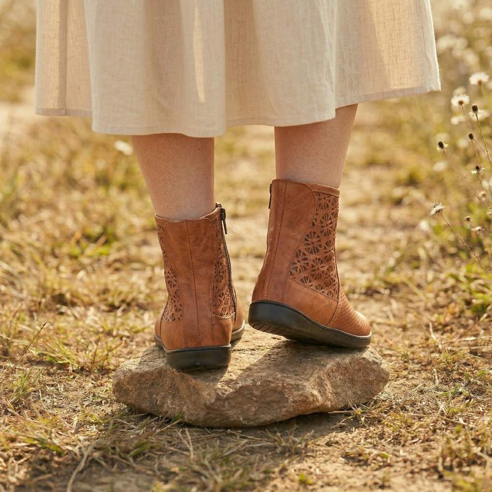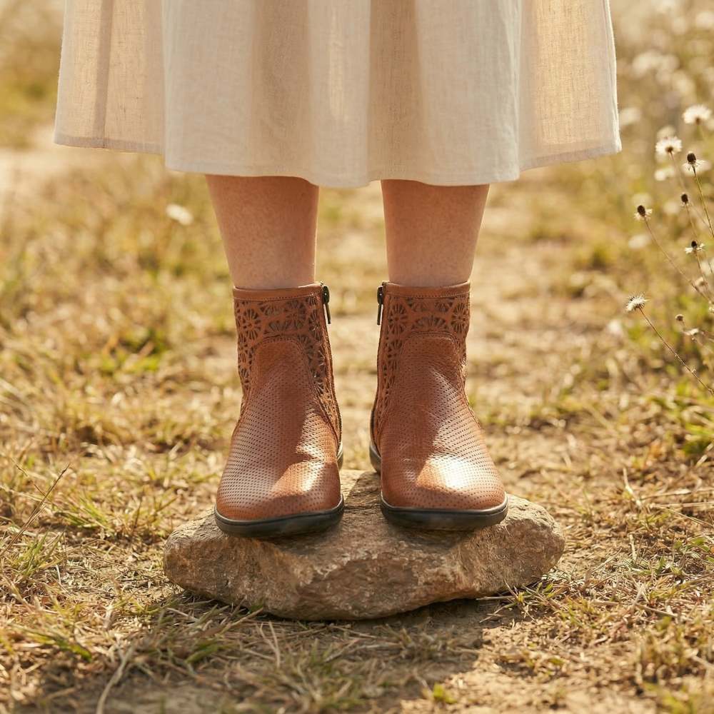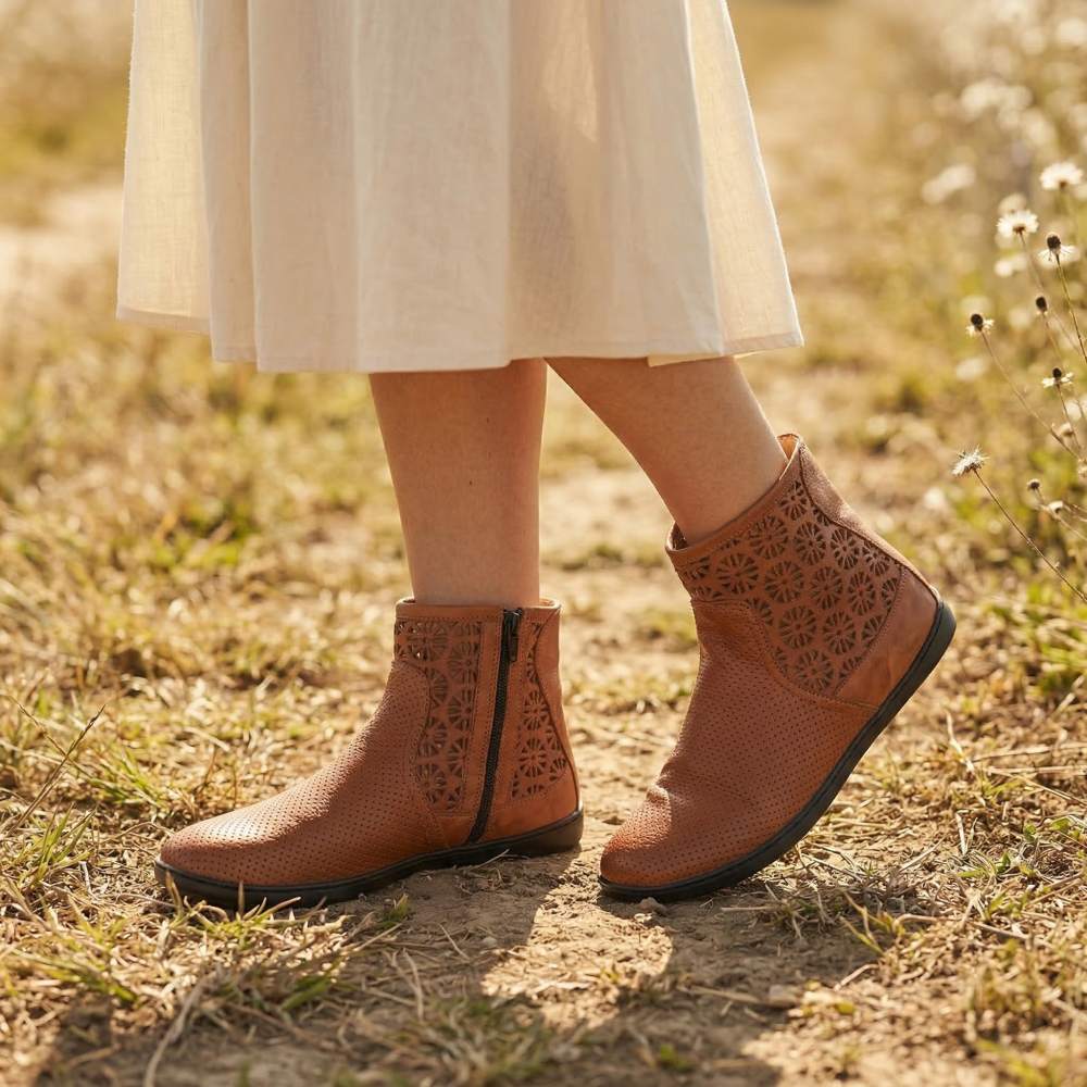 Ako horný materiál sme šili jemnú hladkú kožu, ktorá je perforovaná kvetinovým vzorom na hriadeli, a preto vám ponúka vysokú úroveň dýchacej činnosti. Vo vnútri je pripevnený zips, ktorý uľahčuje vkĺznutie do topánky naboso.